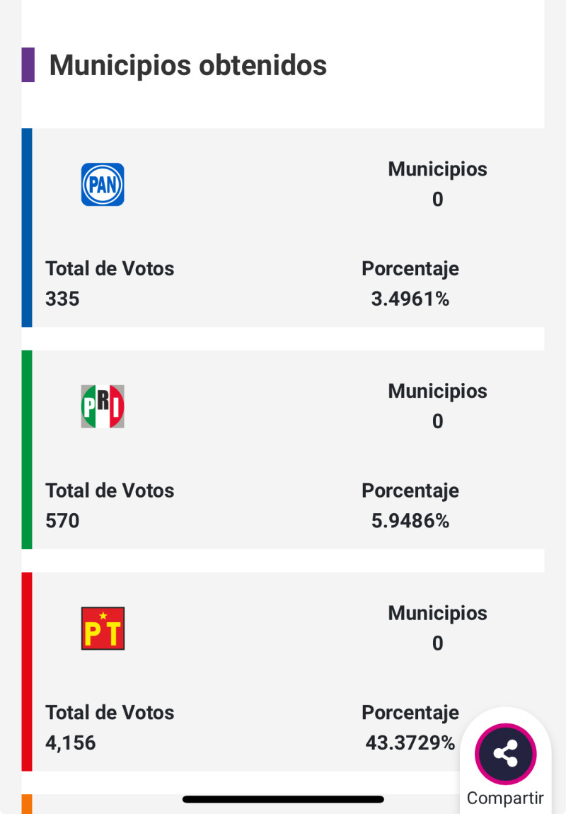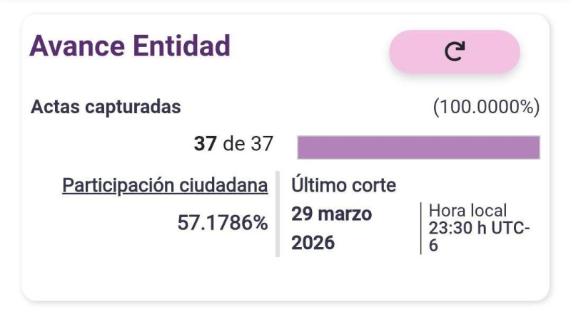 Al corte de las 2:30 horas y con la totalidad de las 37 actas registradas en el PREP, la Candidata del Partido Verde sería la virtual ganadora de la elección municipal extraordinaria en el municipio de Tamiahua celebrada este domingo 29 de marzo del 2026.