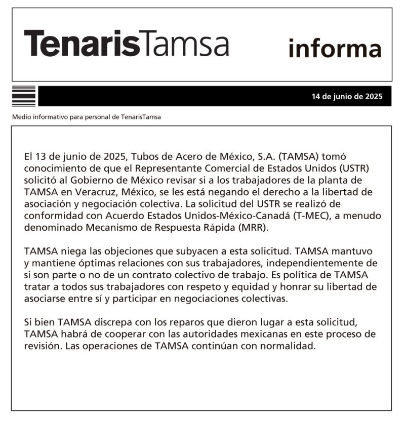 Mediante un comunicado oficial, Tenaris Tamsa da respuesta a lo señalado por el representante comercial de EEUU sobre que se les negaban a sus trabajadores el derecho de libertad de asociación y negociación colectiva.