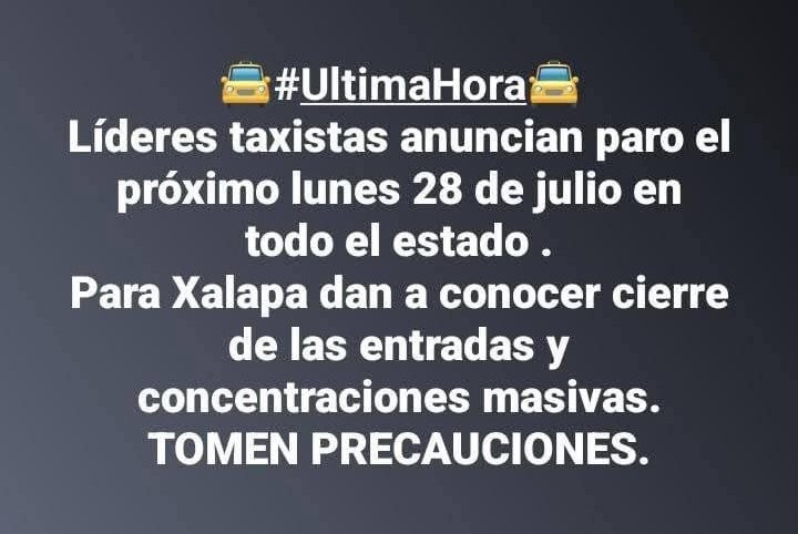 Taxistas se están congregando en varios puntos de Xalapa, Veracruz y Boca del Rio esta mañana y se espera que inicien protestas en las próximas horas. Las manifestaciones son en respuesta a las tarifas actuales de los taxis, las cuales, según los conductores, son inadecuadas.