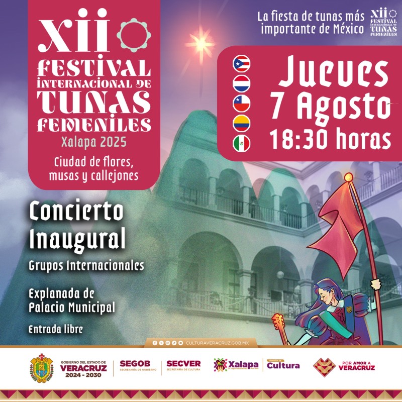 La Secretaría de Cultura de Veracruz (SECVER) invita al XII Festival Internacional de Tunas Femeniles que se realizará en la ciudad capital del 07 al 09 de agosto.