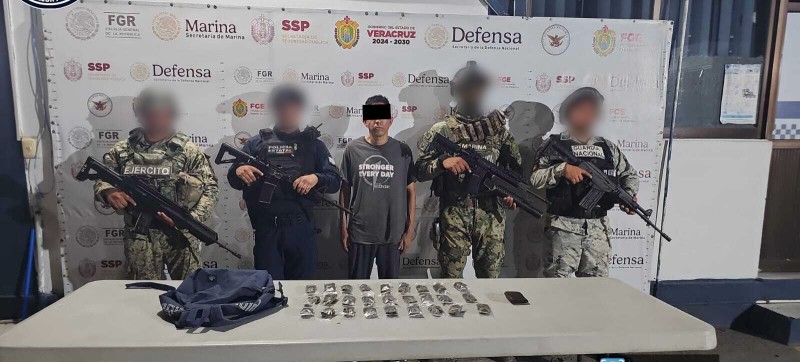 En Tuxpan una persona fue detenida y le fueron incautadas dos bolsitas, una con hierba verde similar a la marihuana y otra con sustancias con características del cristal, así como un rifle, dos pistolas de diábolos, una granada de prueba, balines, una báscula, un chaleco y ropa táctica. En Álamo un menor de edad con 14 dosis de la misma sustancia. En Huatusco dos hombres, asegurándose 10 dosis y dos bolsitas de la sustancia antes mencionadas, además de un vehículo sin reporte de robo.