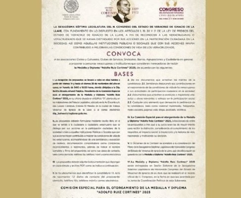 La Comisión Especial para el Otorgamiento de la Medalla y Diploma "Adolfo Ruiz Cortines", edición 2025, de la LXVII Legislatura del estado, ha definido a la terna de aspirantes que será sometida a consideración del Pleno.