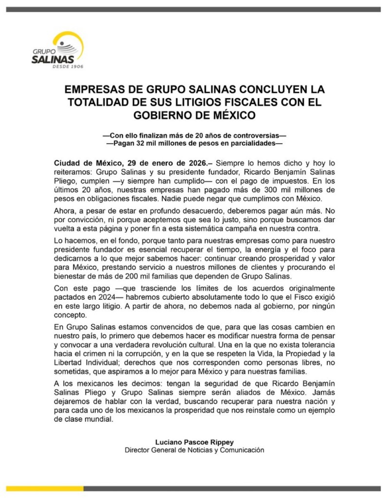 Por su parte, Grupo Salinas publicó en su redes que este pago “lo hacemos porque es momento de dar vuelta a la página, de poner fin a la persecución en nuestra contra y concentrarnos en lo que importa: seguir creando valor para México, nuestros millones de clientes y las más de 200 mil familias que dependen de nuestro grupo empresarial”