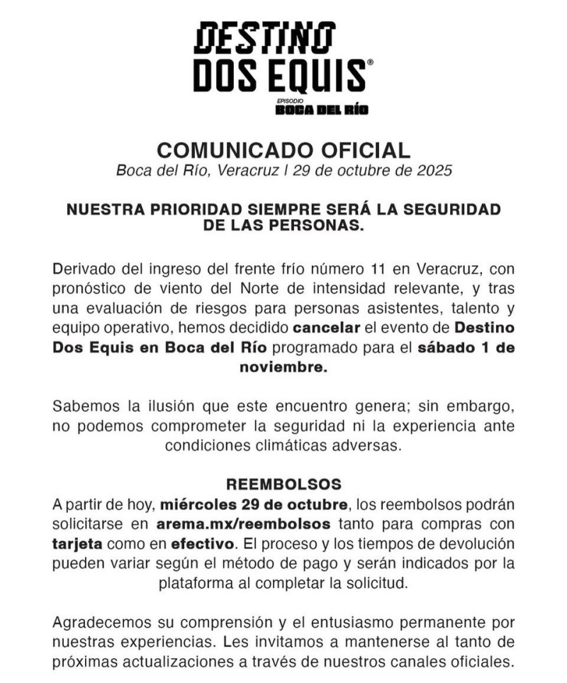 Organizadores cancelan evento “Destino Dos X” en Boca del Rio.