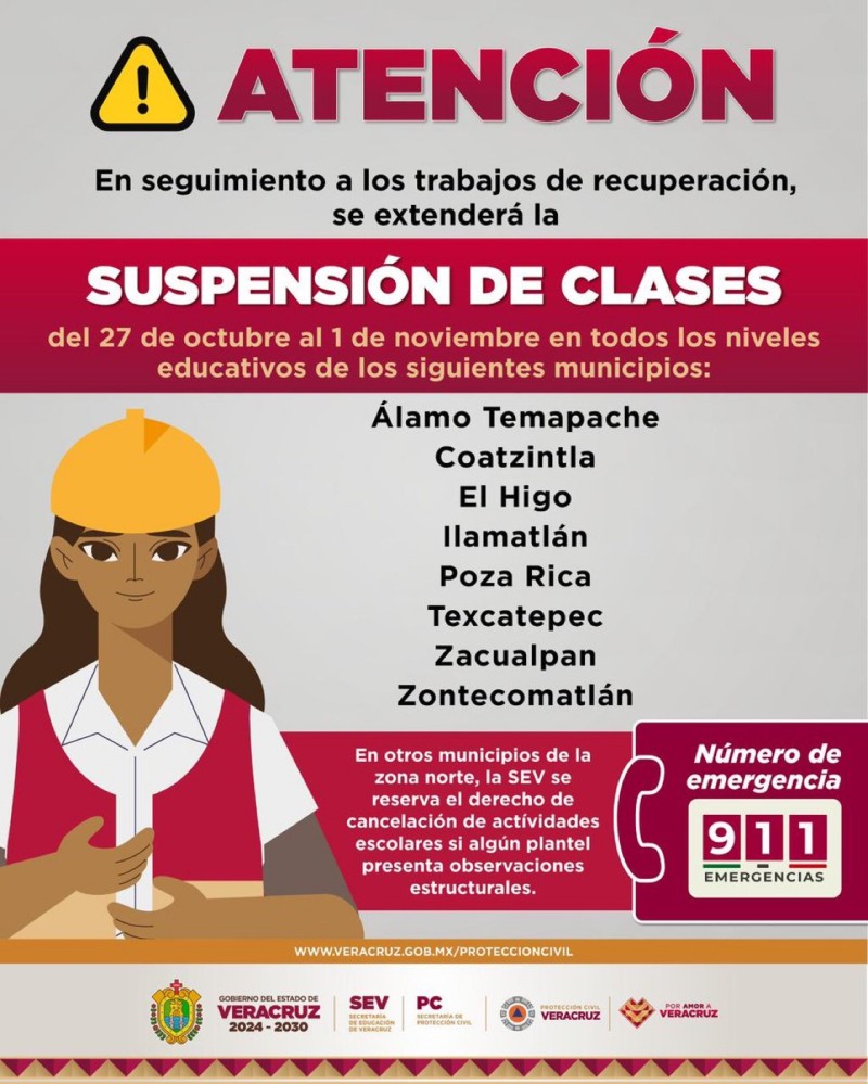 Protección Civil del Estado avisa suspensión de clases en 8 municipios del norte de Veracruz