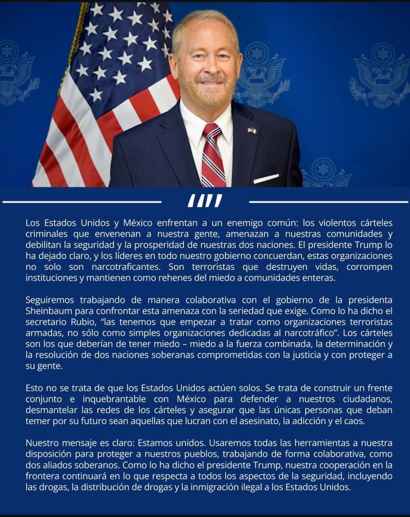 Embajada de USA en México fija posición sobre tema del combate a los cárteles del narcotráfico