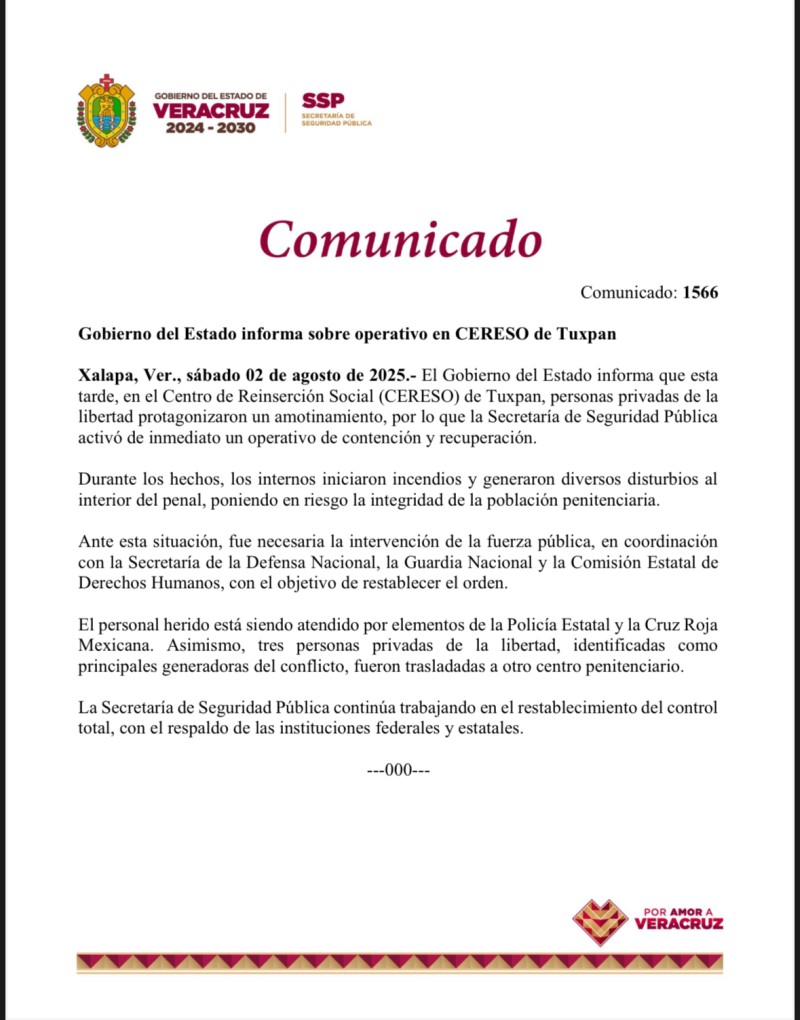 Gobierno del Estado informa sobre operativo en CERESO de Tuxpan